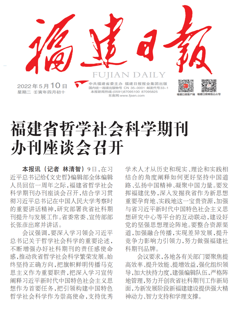 2022年5月9日,在习近平总书记给《文史哲》编辑部全体编辑人员回信一周年之际,福建省哲学社会科学期刊办刊座谈会召开,结合学习贯彻习近平总书记在中国人民大学考察时的重要讲话精神,研究部署我省社科期刊提升与发展工作。省委常委、宣传部部长张彦出席并讲话。